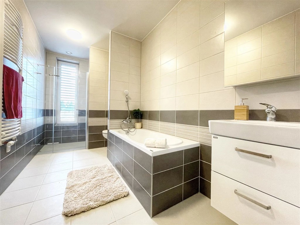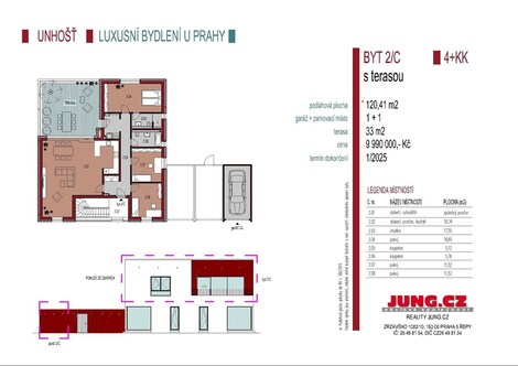 Prodej prestižního nového bytu 4+kk 120m2 s vlastní luxusní terasou 33m2 a garáží spolu s venkovním parkovacím stáním v obci Unhošť u Prahy. Jedná se o jižně orientovaný moderní a luxusní byt, k němuž náleží vlastní luxusní terasa 33m2 pro kontakt s přírodou. Bytová jednotka 2C je součástí novostavby na kouzelném místě nedaleko centra obce Unhošť. Při stavbě jsou používány jen ty nejkvalitnější materiály. Okna - jsou zde instalovaná izolační trojskla s elektrickými předokenními žaluziemi, v celém bytě je použito podlahové topení napojené na moderní a úsporný plynový kondenzační kotel a je zde využita rekuperace. Díky kvalitě použitých materiálů se jedná o nízkoenergetickou stavbu s minimálními provozními náklady. Termín dokončení bytu 2C je 12/2024. Rádi a zdarma Vám zařídíme výhodné financování hypotečním úvěrem. Veškerá občanská vybavenost se nachází v blízkosti, jako například: škola, mateřská škola, samoobsluha, autobusová zastávka s pravidelnými spoji, atd... Skvělá dopravní dostupnost do Prahy 10min. POSLEDNÍ VOLNÉ BYTY PROJEKTU!