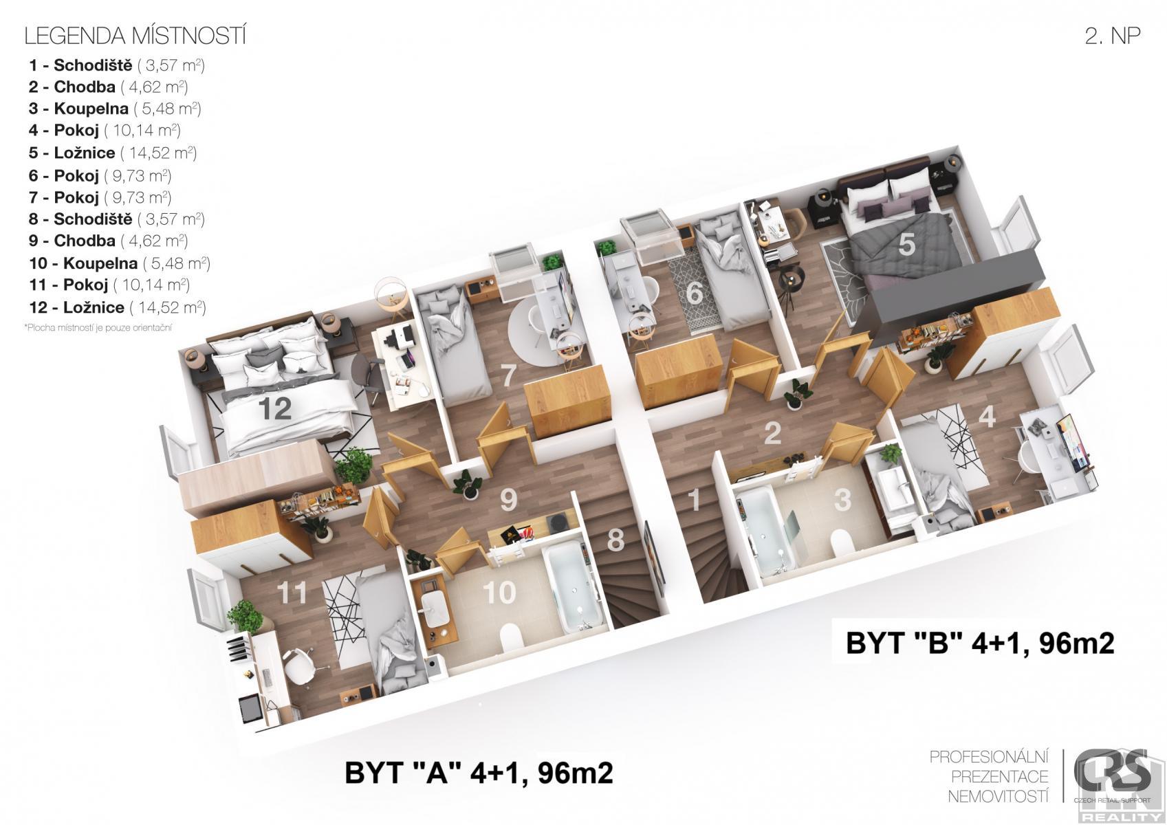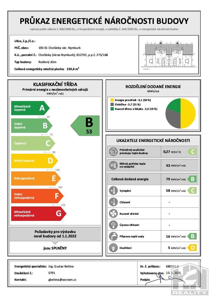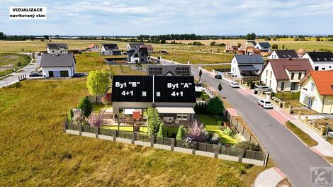 Nabízíme novostavbu bytové jednotky 4+1 - stavebně koncipovaná jako řadový nízkoenergetický dům - v lokalitě Choťánky u Poděbrad. Zahájení výstavby - podzim 2025, k nastěhování léto 2026. V základním provedení je bytová jednotka 4+1 s užitnou plochu 96 m2 a zastavěnou plochu o velikosti 59 m2. Dispozice: v 1.NP se nachází praktická vstupní hala, velký obývací pokoj propojený s kuchyní a jídelnou, pohodlné schodiště vedoucí do 2.NP na horní galerii s přímým vstupem do prosvětlené ložnice a dvou útulných dětských pokojů. Jednotka bude stavebně dokončena včetně vytápění, obkladů, dlažeb, sanitární keramiky, podlahových krytin a vnitřních dveří. Vytápění je řešeno tepelným čerpadlem , Slunný pozemek s krásným výhledem o rozloze 233 m2. Součástí domu jsou dvě parkovací stání. Termín dokončení léto 2026. Energetický průkaz PENB třida: B. Byt A 4+1 o velikosti 96 m2 + zahrada 233m2, dvě parkovací stání Cena 6.900.000 CZK Byt B 4+1 o velikosti 96 m2 + zahrada 233m2, dvě parkovací stání Cena 6.900.000 CZK V klidné lokalitě Choťánky u Poděbrad naleznete veškerou občanskou vybavenost pro bydlení i podnikání, kulturní a sportovní vyžití je dostatečně zajištěné v lázeňském městě Poděbradech. Pro milovníky golfu je vyhlášené poděbradské hřiště vzdáleno pouhé 2 km. Cyklostezky okolo Labe jsou přímo napojeny na tuto část města. Pro více informací o této nemovitosti nebo sjednání prohlídky nás prosím kontaktujte nebo vyplňte níže uvedený formulář, rádi Vám pomůžeme.