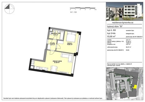 Nabízíme k prodeji elegantní byt 2+kk o velikosti 53.60 m2 v projektu Rezidence Tyršovka, který vzniká v samotném centru města Nymburk. Dokončení je plánováno na 3Q roku 2027. Parametry bytu: dispozice: 2+kk plocha bytu: 53.60 m2 umístění: 2. NP, objekt B orientace: východ O projektu: Rezidence Tyršovka přetváří bývalý průmyslový areál s historickou hodnotou na moderní a komfortní bydlení. Součástí projektu je uzavřený vnitroblok s japonskou atriovou zahradou, dětským hřištěm a odpočinkovými zónami. Lokalita nabízí kompletní občanskou vybavenost v pěší dostupnosti a výbornou dopravní dostupnost - do Prahy se vlakem dostanete za 40 minut, do Mladé Boleslavi za 30 minut. Další informace: Součástí bytu není kuchyňská linka, ale jsme schopni její realizaci zajistit ve spolupráci s kuchyňským studiem Gorenje. Parkování: Možnost zakoupení parkovacího stání za cenu 450 000 Kč (není zahrnuto v ceně bytu). Více o projektu naleznete na webu: Rezidence Tyršovka