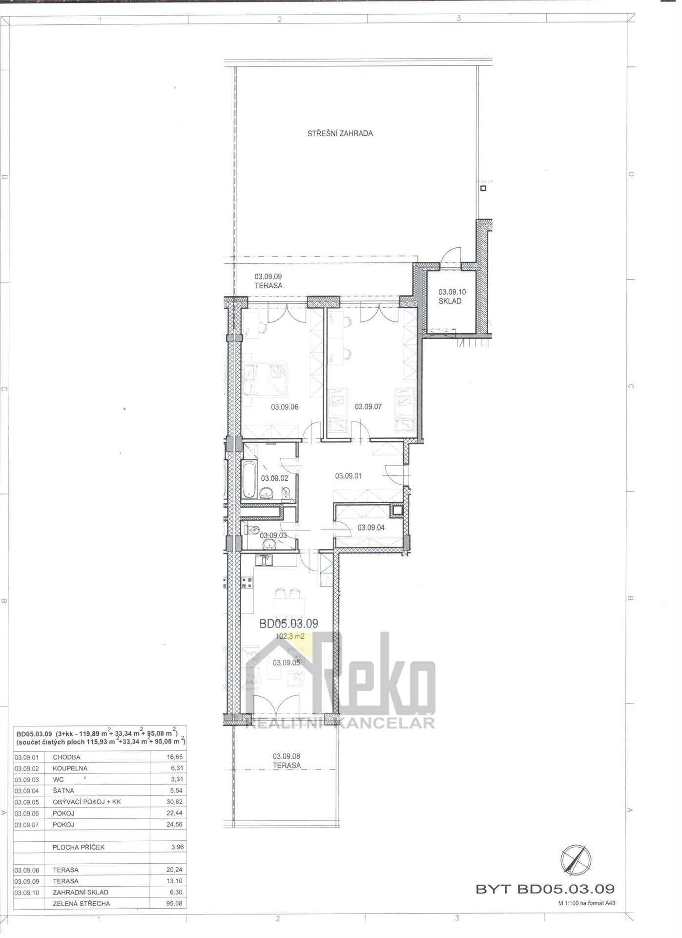 Zprostředkujeme prodej bytu o dispozici 3+kk s výměrou 115,93 m2, dvěma terasami a střešní zahradou s celkovou výměrou 128,42 m2 v žádané lokalitě v Berouně "Na Máchovně", s jehož výstavbou se započalo v září 2023 a bude dokončeno v prosinci 2025. V bytě, umístěném v 3.NP bytového domu je obývací pokoj s kuchyňským koutem, dva samostatné pokoje, šatna, chodba, samostatné WC a koupelna. V koupelně umyvadlo, akrylátová vana, WC a otopný žebřík, na podlaze dlažba. Okna plastová, laminátové plovoucí podlahy. U jedné terasy se nachází zahradní skládek. K bytu náleží sklepní kóje a garážové parkovací stání. Dům je bezbariérový s výtahem. Velmi dobrá dostupnost na Prahu a nájezd na dálnici D5. Veškerá občanská vybavenost v místě. Výstavba navazuje na již úspěšně realizované a prodané projekty I. - IV. etapy.
