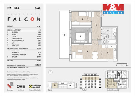 Rezidenční projekt Residence Falcon tvoří dvě budovy umístěné v klidné lokalitě Mělníka - ul. Sokolská. Oceníte rychlé spojení do Prahy (cca 30 min metro Letňany, PID), kompletní občanskou vybavenost v docházkové vzdálenosti a školu přímo v lokalitě. Okolí je ideální pro aktivní život - zeleň, cyklostezky, sportovní zóny, prostor pro odpočinek. Nabízíme nejdostupnější 3+kk jednotku v projektu, s podlahovou plochou 66,07 m2, umístěnou ve 4. NP. Součástí ceny je balkon 17,77 m2, prostorný sklep 9 m2 a parkovací stání. Standardy Friendly a Gorgeous umožňují volbu stylu dokončení - oba pracují s kvalitními materiály, trojskly a velkoformátovým prosklením. Prodej i výstavba už byly oficiálně spuštěny. Residence nabídne oplocení, kamerový systém, kontrolovaný přístup a chráněné atrium. Dokončení 3. kvartál 2027. Pro porovnání dalších dostupných 3+kk i jiných dispozic nás neváhejte kontaktovat - Rádi Vám zašleme kompletní přehled.