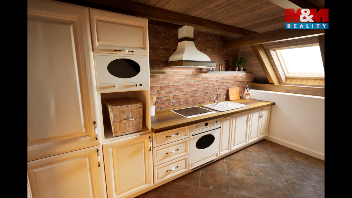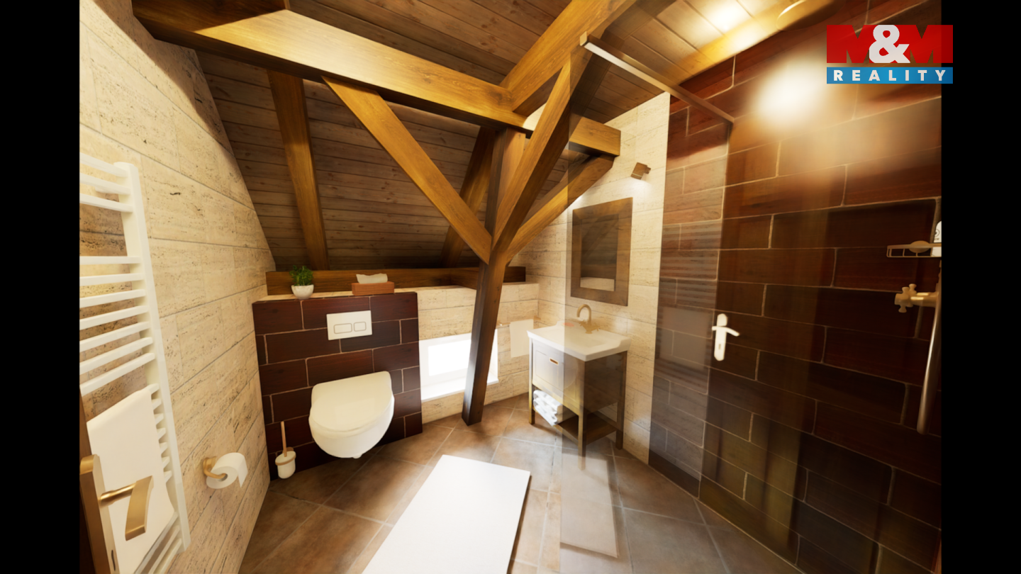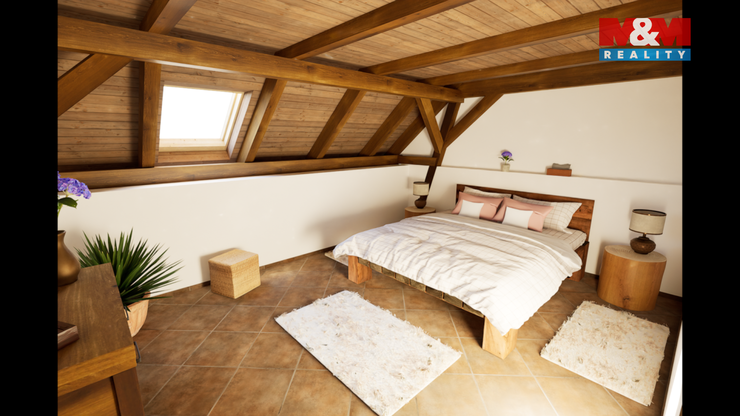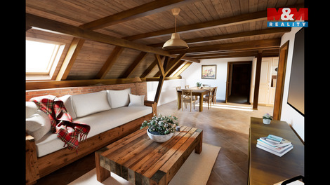 Tento podkrovní mezonetový byt se nachází ve 2.NP rekonstruovaného domu, ve kterém je více bytů venkovského stylu. Ve spodním podlaží bytu je obývací pokoj s kuchyňským koutem, ložnice a koupelna s WC. V patře pak další koupelna s WC a dvě ložnice. Orientace bytu je východ a západ. Dům je zateplen, na střeše jsou nové betonové tašky, PENB typu B. Nízké náklady na energie a vodu. Topení a teplá voda je tepelným čerpadlem, vytápění v podlaze. Voda obecní vodovod, splachování dešťovka. Okna plastová, trojsklo, na zemi dlažba a plovoucí podlaha. V domě je bezdrátový internet a společná anténa. Součástí kupní ceny jsou: podlahy, zárubně, dveře, koupelna vč. obkladů, sanity a skříňky pod umyvadlo a plně vybavená kuchyňská linka. Ve dvoře objektu bude park s lavičkami a herními prvky pro děti, dále wellness. Parkování zajištěno, možnost i dokoupení garáže. Na snímcích použita vizualizace. Byt číslo 9.