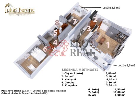 Představujeme Vám ke koupi prostorný a světlý mezonetový byt o dispozici 3+1/2xL se dvěma lodžiemi o celkové užívané ploše 74,4 m2 (z toho podlahová plocha bez lodžií činí 67,1 m2) + sklep 2 m2. Byt se nachází ve 4. nadzemním podlaží panelového domu s výtahem na adrese Plzeňská 3102, Kladno - Kročehlavy, v žádané části sídliště Sítná. Byt zaujme praktickou dispozicí i vysokým standardem vybavení. Je připojený k zabezpečovacímu systému Jablotron, přístup do bytu vede přes uzamykatelnou chodbu oddělenou od výtahů a schodiště. Kuchyňská linka na míru v hodnotě 260 000 Kč byla instalována před 2 měsíci a je vybavena vestavnými spotřebiči (myčka, plynový sporák, elektrická trouba, digestoř, lednice s mrazákem). V bytě jsou snížené stropy s bodovými světly, v ložnici i pokoji v horním patře lesklé stropní panely. V předsíni i pokojích jsou prostorné vestavěné skříně a další úložný prostor nad schodištěm. Dům má 11 nadzemních podlaží, je celkově revitalizován, má plastová okna, 2 výtahy a v přízemí kočárkárnu. Vytápění je centrální dálkové, napojení na všechny inženýrské sítě. Parkování je možné na parkovišti vedle domu nebo v přilehlých ulicích, kde bývá dostatek volných míst. Měsíční náklady činí 7 188 Kč/ 3os, z toho fond oprav 2 380 Kč. Lokalita Plzeňská - Sítná nabízí veškerou občanskou vybavenost a špičkovou dopravní dostupnost. V okolí najdete Sportovní gymnázium Kladno (238 m), MŠ Lenka Honsová (118 m), Albert (735 m), Lékárnu Sítná (113 m), Poštu Kladno 1 (1,1 km), restauraci Krušovickou (180 m), dětské hřiště Plzeňská (60 m), kino Hutník (218 m) a Divadélko U Zvonu (970 m). V docházkové vzdálenosti je také ČVUT - fakulta biomedicínského inženýrství a několik fitness center. Pro milovníky sportu a odpočinku je v blízkosti Sportovní areál Sletiště - krytý i venkovní aquapark, stadion s dráhou pro kola a in-line brusle, workoutová hřiště a lanové centrum. Za ním navazuje jezdecká farma a rozsáhlý lesopark Sletiště, ideální pro procházky, běh, cyklistiku i sběr hub. V létě je oblíbená rekreační oblast Bažantnice s otevřenými bazény a travnatými loukami. V okolí nechybí ani rozsáhlá nákupní infrastruktura - Tesco, Kaufland, Billa, Albert, Penny Market, Norma a OC Central Kladno; plánována je výstavba Globus. V docházkové vzdálenosti banky (KB, Česká spořitelna, Raiffeisenbank), Baumax i kulturní centrum Kladno. Zastávka MHD „Kladno, Sítná“ je cca 238 m od domu, železniční stanice Kladno-město 1,2 km. Do Prahy (Ruzyně / Dejvice) trvá cesta autem cca 19 minut (26 km) nebo vlakem asi 40 minut. Byt je vhodný jak pro rodiny s dětmi, tak jako bezpečná investice s výnosností kolem 3,7 % ROI. Financování je možné hypotékou, kterou rádi pomůžeme zajistit.