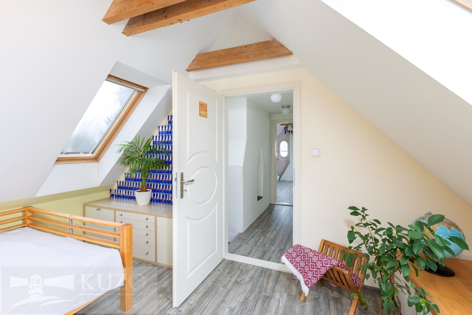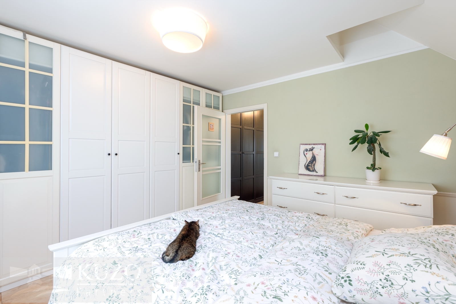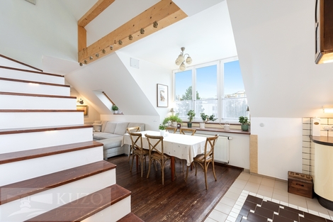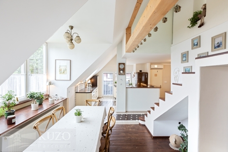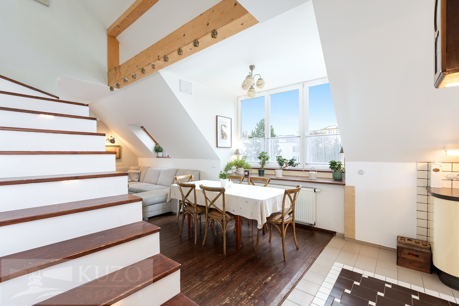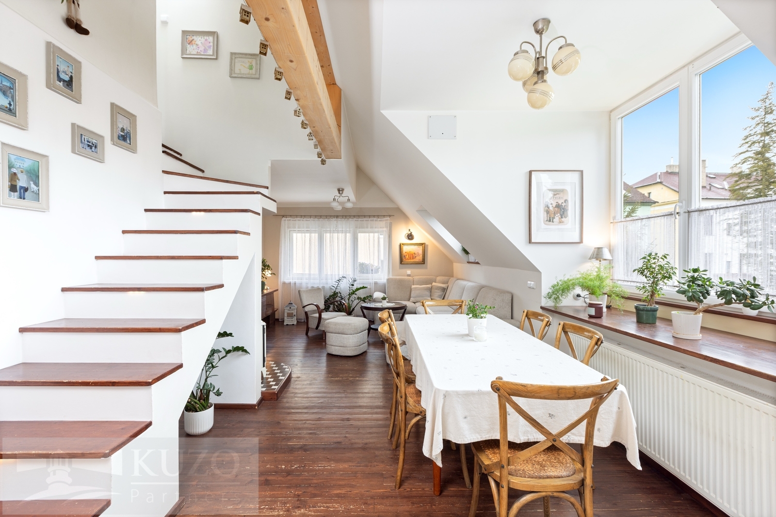 Nabízíme ke koupi výjimečný mezonetový byt o užitné ploše 109 m2, nacházející se ve 3. nadzemním podlaží komorního bytového domu s pouhými třemi bytovými jednotkami, v klidné a velmi vyhledávané lokalitě ulice Boženy Němcové v centru Mladé Boleslavi. Jedná se o byt s opravdu jedinečným charakterem, který zaujme svou otevřeností, dostatkem přirozeného světla a krásnými výhledy do zeleně za domem, přičemž atmosféru obývacího prostoru podtrhují stylová krbová kamna. Byt prošel velmi vkusnou rekonstrukcí, díky které působí moderně, vzdušně a nadčasově. Po vstupu do bytu se ocitnete v chodbě s velkými vestavěnými šatními skříněmi, které poskytují dostatek úložného prostoru. Z chodby je přímý vstup do světlé koupelny, ložnice a také do velkorysého otevřeného obytného prostoru s prostorným kuchyňským koutem. Tento hlavní obytný prostor je přirozeným centrem bytu a nabízí přímý vstup na prostornou terasu o výměře 18,23 m2, ideální pro relax, posezení i vychutnání si klidného výhledu do okolní zeleně. Z obývací části vedou schody do horního patra mezonetu, kde se nachází další dva pokoje a místnost s přípravou na druhou koupelnu s WC, což nabízí možnost dalšího komfortního rozšíření bydlení dle vlastních potřeb. K bytu dále náleží sklepní kóje o velikosti 14,8 m2, která poskytuje dostatek praktického úložného prostoru. Celý byt je mimořádně světlý, slunečný a působí velmi harmonickým dojmem. Díky své dispozici, terase, výhledům a kvalitní rekonstrukci se jedná o výjimečné bydlení v centru města, které se na trhu objevuje jen zřídka.