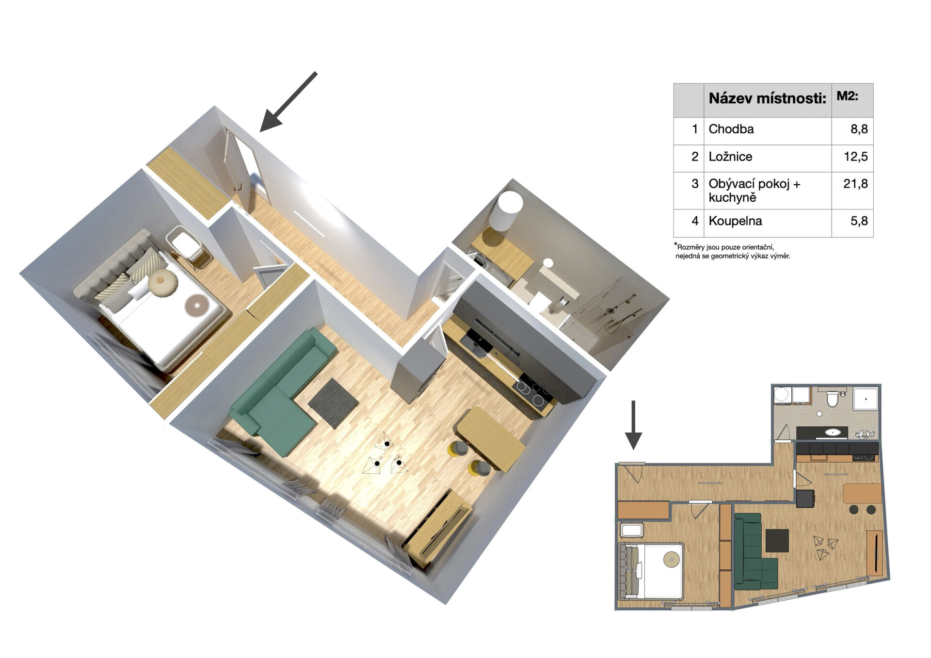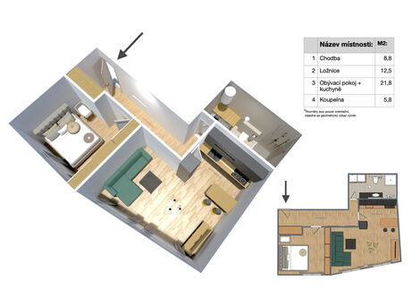 Hledáte moderní byt 2+kk v klidné lokalitě s výbornou dostupností do Prahy? Pak pro vás máme skvělou nabídku v obci Předměřice nad Jizerou. Nabízený byt se nachází ve 2. nadzemním podlaží cihlového domu a nabízí celkovou plochu 55,6 m2, včetně zděného sklepa o velikosti 5,1 m2. Dispozice bytu je prakticky řešená - světlý obývací pokoj s kuchyňským koutem, samostatná ložnice, koupelna s toaletou a předsíň tvoří příjemný a funkční celek. Veškerý nábytek je v celém bytě řešen truhlářem na míru, vše v nadstandardním provedení. Dům prošel kompletní rekonstrukcí a byl zkolaudován v roce 2023, takže vás čeká nové, moderní bydlení bez dalších investic. Energetická náročnost třídy B zajišťuje nízké provozní náklady, což oceníte dlouhodobě. Lokalita nabízí vše, co potřebujete ke komfortnímu životu - obchod, poštu, sportovní areál, mateřskou i základní školu máte v docházkové vzdálenosti, přičemž školka i škola se nachází přímo naproti domu. Výborná je také dopravní dostupnost - díky dálnici D10 i PID jste během krátké chvíle v Mladé Boleslavi, Brandýse nad Labem - Staré Boleslavi nebo v Praze. K domu náleží tři parkovací stání na vlastním pozemku, přičemž jedno parkovací stání je přímo k tomuto bytu. Další parkování je možné pohodlně v okolí. Bonus navíc představuje příprava na nabíjení elektromobilů, společná technická místnost a úklidová komora. Byt je napojen na elektřinu, internet a obecní kanalizaci, zásobování vodou zajišťuje vlastní studna s čističkou. O komfort se stará elektrické podlahové vytápění a moderní elektrický bojler na ohřev vody. Ideální volba jak pro vlastní bydlení, tak jako investice k pronájmu. Neváhejte a domluvte si prohlídku - podobné nabídky se dlouho neohřejí.