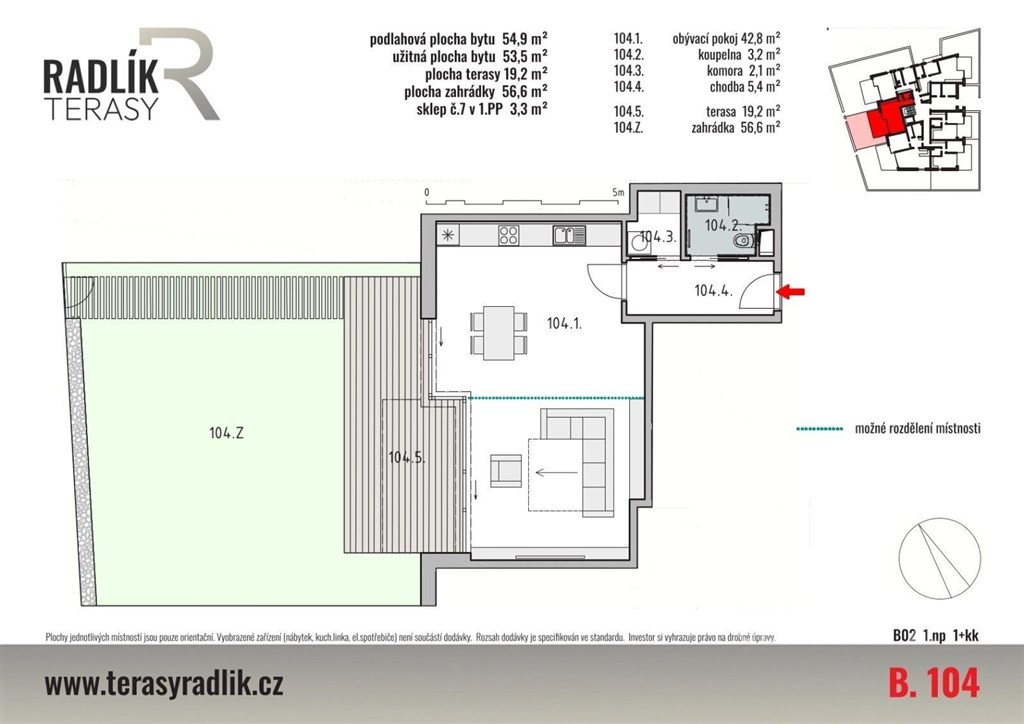 Hledáte klidné bydlení jen kousek od Prahy, kde si můžete užít prostor, soukromí a kontakt s přírodou? Tento moderní byt 1+kk by mohl být přesně pro vás. Nabízím byt o velikosti 55 m2, který vás nadchne prostornou terasou 19 m2 a zahradou 57 m2, jež prakticky rozšiřují obytný prostor. Ideální je pro ranní kávu, letní posezení s přáteli nebo klidné večery pod hvězdami. Dispozice bytu je promyšlená a pohodlná, jelikož obytný pokoj s kuchyňským koutem navazuje přímo na terasu a nabízí maximální komfort pro každodenní život. Součástí bytu je také sklepní kóje 3,3 m2, kam snadno uložíte věci, které nepotřebujete mít po ruce. Komfort bydlení zvyšují elektrické zatemňovací žaluzie a podlahové topení. Byt se nachází v moderním nízkopodlažním cihlovém domě vybaveném výtahem, který splňuje nároky na komfortní a moderní bydlení. Stavba je zařazena do energetické třídy B velmi úsporná. Dům je součástí rezidenčního projektu zasazeného do klidného a zeleného prostředí. Veškerou občanskou vybavenost najdete v centru, přičemž hned naproti domu se nachází Billa. Projekt je realizován v několika etapách a nabízí bytové jednotky různých dispozic vhodné jak pro vlastní bydlení, tak jako investici. Lokalita Radlík zaujme kombinací klidného prostředí v blízkosti přírody a výborné dopravní dostupnosti do Prahy. K bytu je možné dokoupit vnitřní parkovací stání za 488 000 Kč, které není součástí kupní ceny. Pokud vás nabídka zaujala, neváhejte mě kontaktovat. Rád vás tímto bytem osobně provedu.
